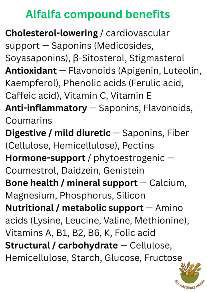 Alfalfa contains saponins, phytoestrogens (coumestans and isoflavones), vitamins A, C, E, and K1, minerals calcium, magnesium, and potassium, chlorophyll, and carotenoids.